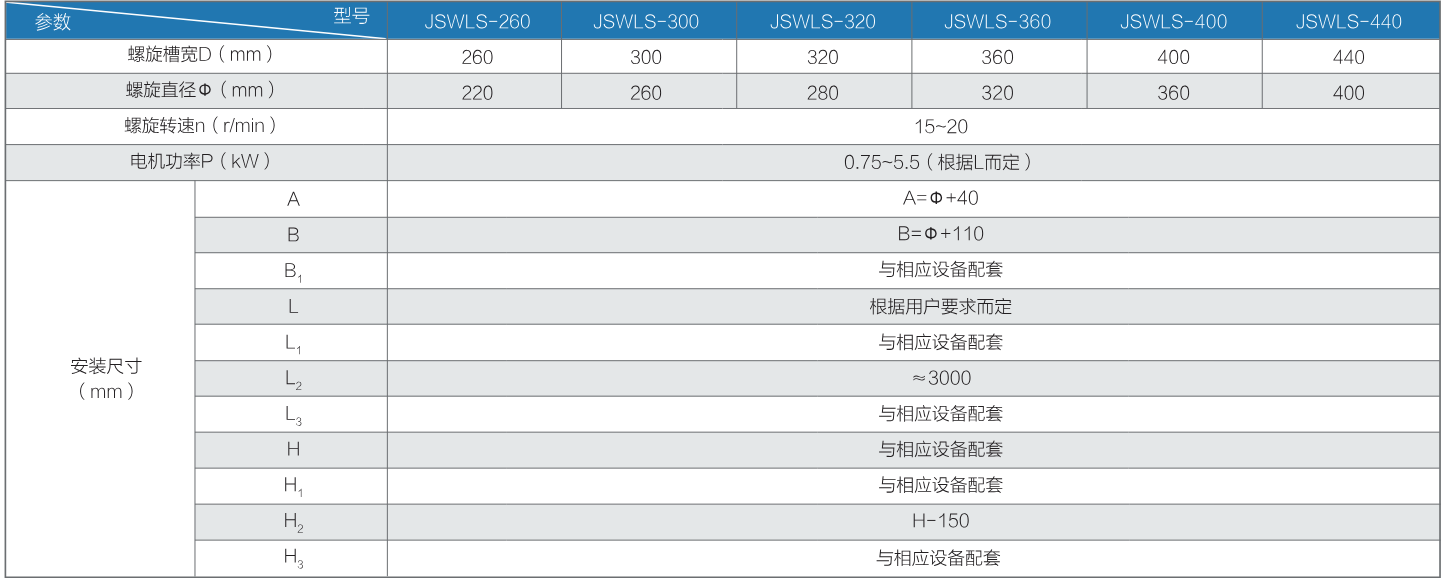 JSWLS型无轴螺旋输送机适用于城镇污水处理厂、住宅小区污水预处理装置、市政雨/污水泵站及自来水厂等的栅渣处理,它主要与格栅或脱水机等设备配套使用,将栅渣或脱水污泥进行输送。