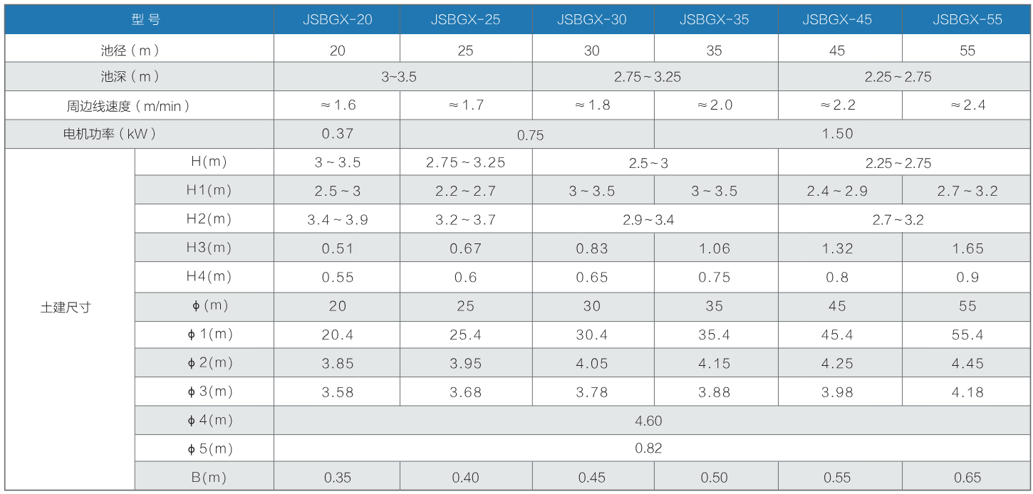 JSBGX型周边传动刮吸泥机适用于中心进水、周边出水、中心排泥的中、大型池径的辐流式沉淀池;主要用于城镇污水处理厂二沉池内排泥。