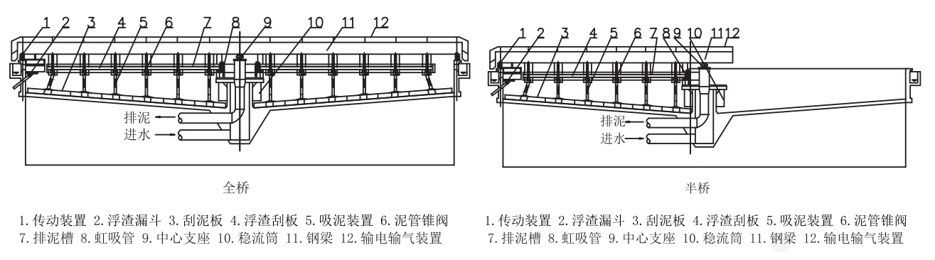 该设备主要由钢梁、溢流堰、稳流筒、中心泥罐、排泥槽、刮板、吸泥装置、浮渣收集和排除设施、输电输气装置以及动力传动装置等部分组成。