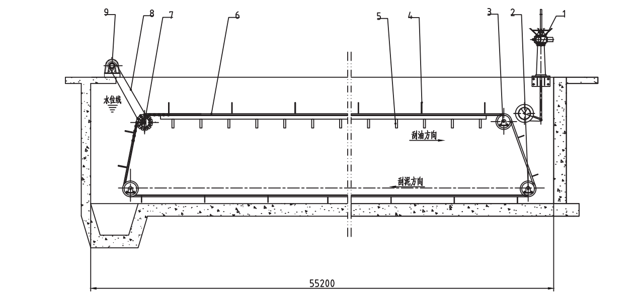 减速驱动装置通过链轮副将动力传递于牵引链带动刮板沿池内上下轨导作定向回转连续运行,运行过程中刮板将池底泥沙、池面油渣不断分别刮集于集泥槽、排渣管排出池外。