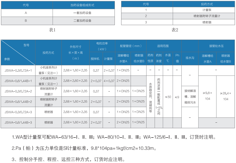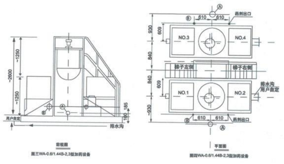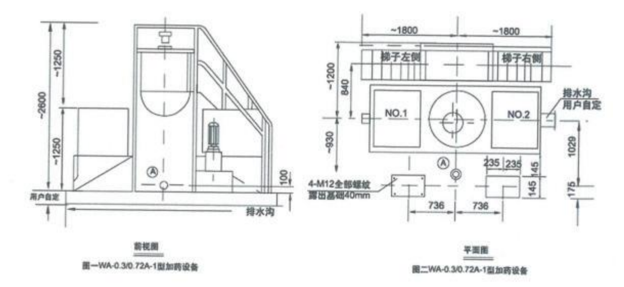 JSWA型加药设备配有一个玻璃钢材质的药剂溶解糟,并配有一套电动搅拌机、两个药剂溶液箱,一套投药装置及配管、钢制平台、扶梯等组成一个整体。