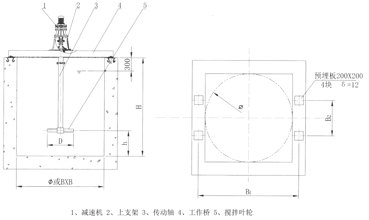 该设备桨叶采用折桨式,它由立式电机经减速机驱动桨板搅拌,使将水体与投加的混凝剂等药剂按一定比例稀释后经搅拌机搅拌,达到所需的配置浓度及防止沉淀。