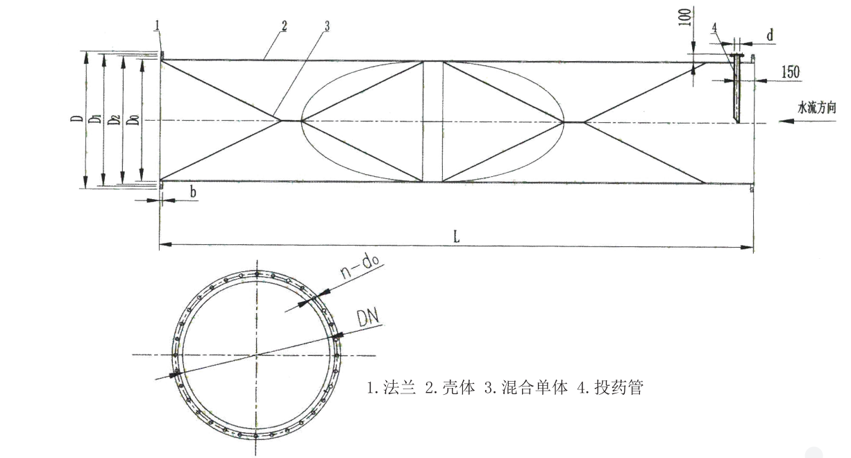该设备一般由2节或3节单体管组成,相互之间正逆向交叉组合,介于管道中间,并与管道作法兰连接,使投加的混凝剂、助凝剂、消毒剂在管道内瞬时混合。