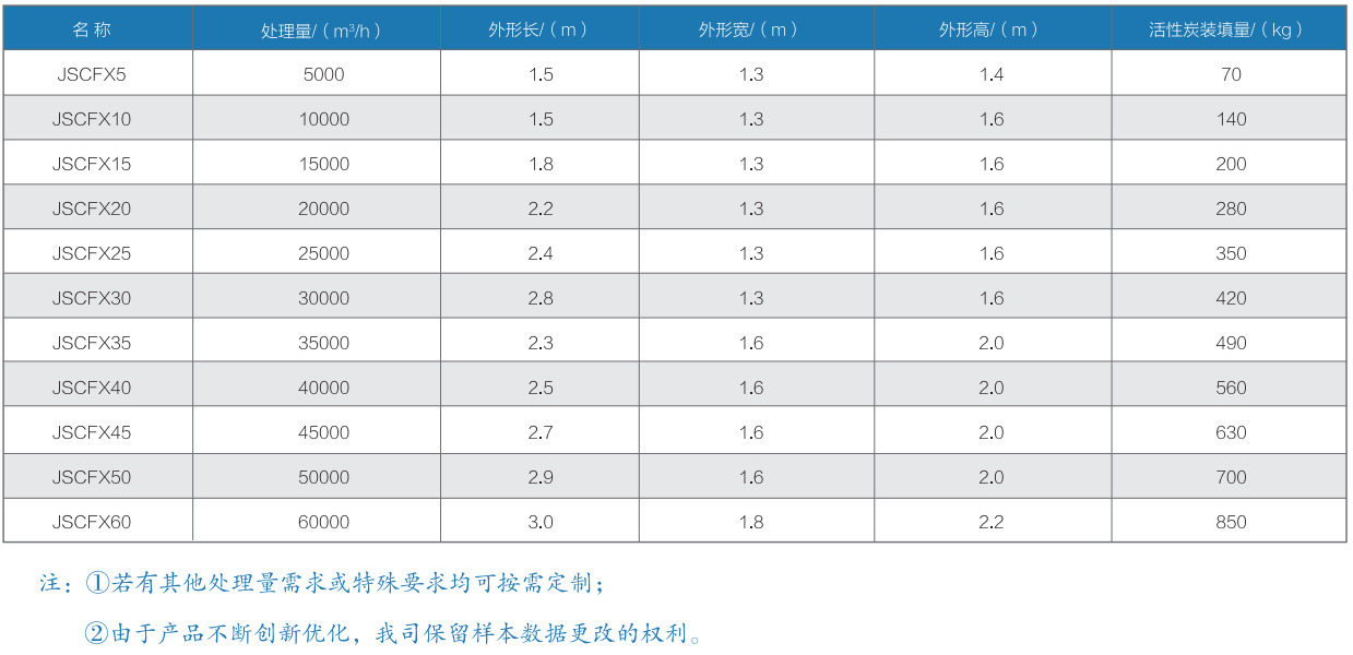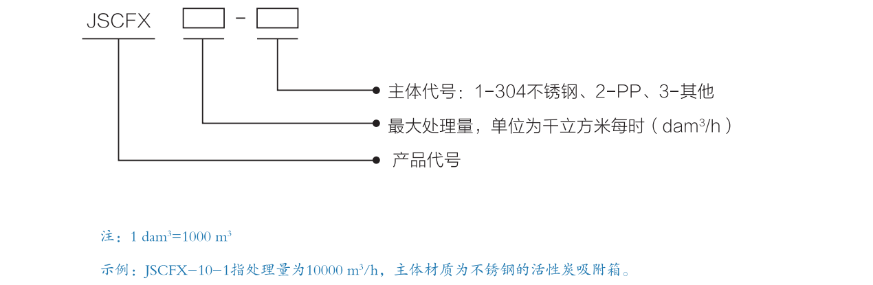 示例:JSCFX-10-1指处理量为10000 m³/h,主体材质为不锈钢的活性炭吸附箱。