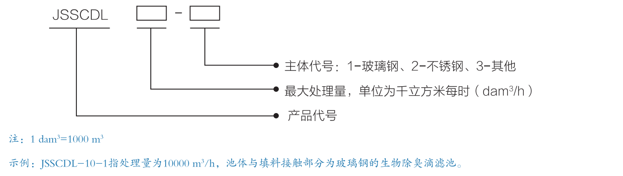 示例:JSSCDL-10-1指处理量为10000m³/h, 池体与填料接触部分为玻璃钢的生物除臭滴滤池。