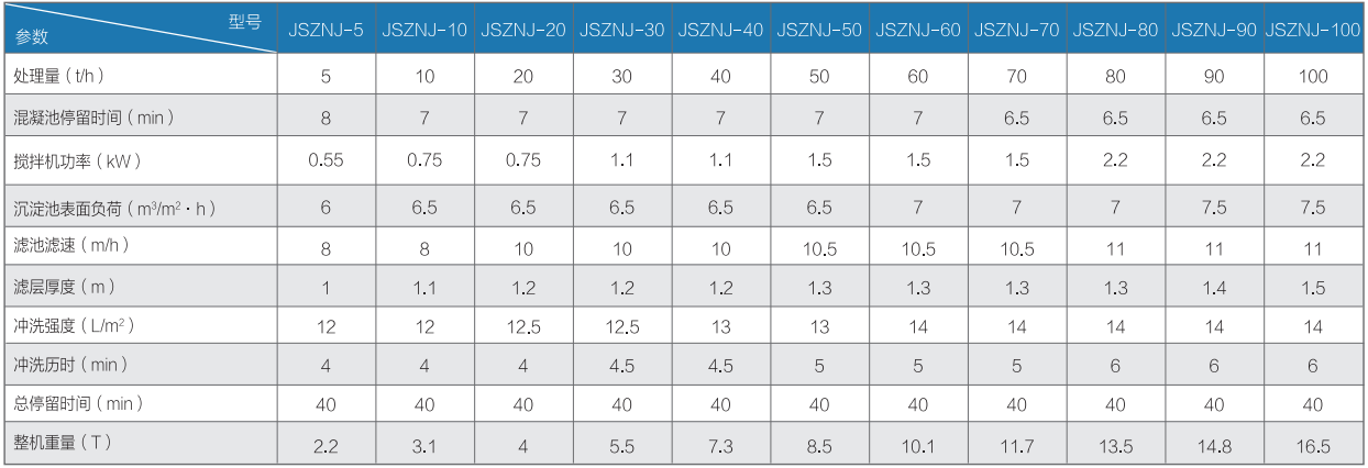 JSZNJ型一体化净水器将水质净化的混凝、反应、澄清、过滤等工艺流程组合成一体,技术先进,设计新颖,结构紧凑,节约面积和投资,管理简单,操作方便,处理源水浊度500~1000PPm(短时间可达1500PPm),出水浊度小于3PPm,经加氯消毒,即可达国家饮用水标准。
