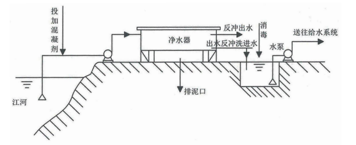 该设备和城市供水厂的净化流程一样。它有:混凝池、沉淀池、过滤池、水质稳定装置、反冲洗装置、水泵及电气控制柜。现分别介绍如下:
