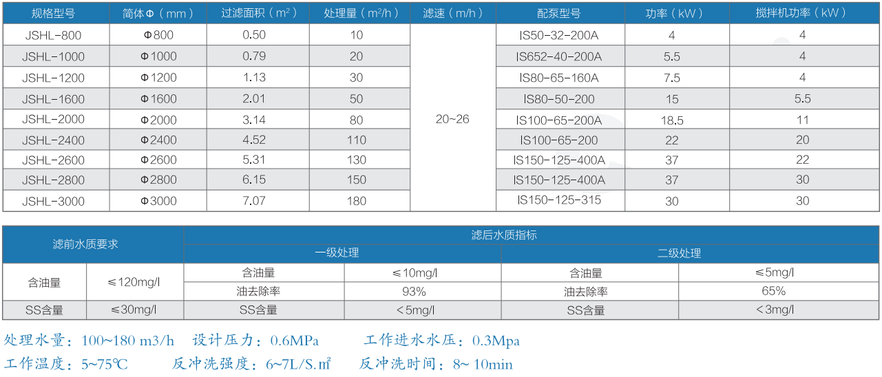 该设备是利用过滤分离原理研制成功的分离设备,采用了耐油滤材特殊核桃壳作为过滤介质,利用核桃壳比表面积大、吸附力强、截污量大的特性,去除水中的油和悬浮物。该设备有自动和手动两种控制方式。过滤时,水流自上而下,经布水器、滤料层、集水器,完成过滤。反洗时,搅拌器翻转滤料,水流自下而上,使滤料得到彻底清洗再生。